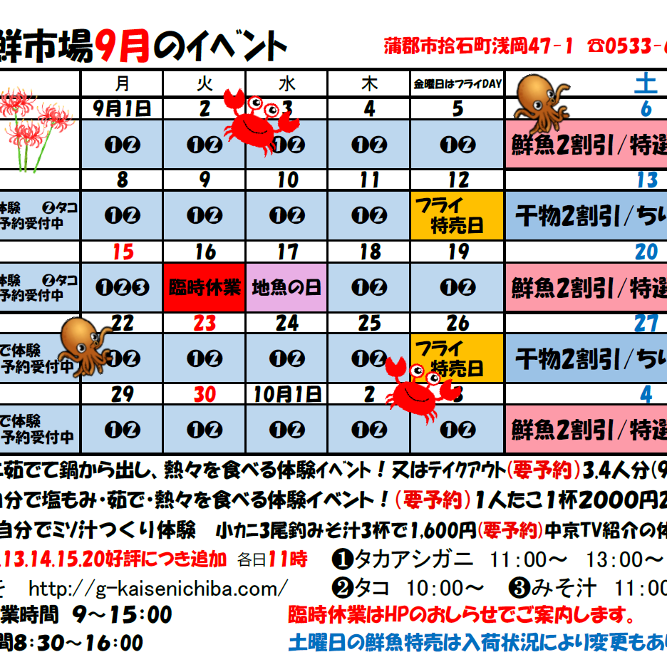 蒲郡海鮮市場では水揚げしたばかりの獲れたての海鮮物をご提供しています。