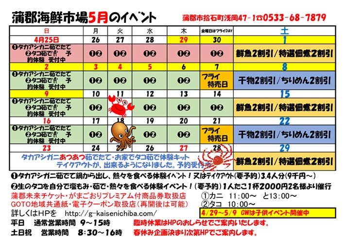 蒲郡海鮮市場では、毎月楽しい&お得なイベントをご用意しております。