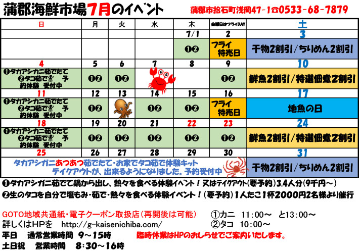 イベント情報 ホーム > イベント情報 > 7月のイベントのご案内! 7月のイベントのご案内! 蒲郡海鮮市場では、毎月楽しい&お得なイベントをご用意しております。 今月も大人気「タカアシガニ茹で体験」「タコ茹で体験」がもりだくさん!先月に引き続き、タカアシガニあつあつ茹でたて・お家でタコ茹で体験キットのテイクアウトもございます!現在ご予約受付中です★ ※GOTO地域共通紙・電子クーポンは現在休止中です。 蒲郡海鮮市場では、スタッフの健康管理やマスク着用、消毒の徹底などお客様の安全に細心の注意を払い営業をしております。イベント日程表をご確認のうえ、ご家族やお友達とぜひお越しください!