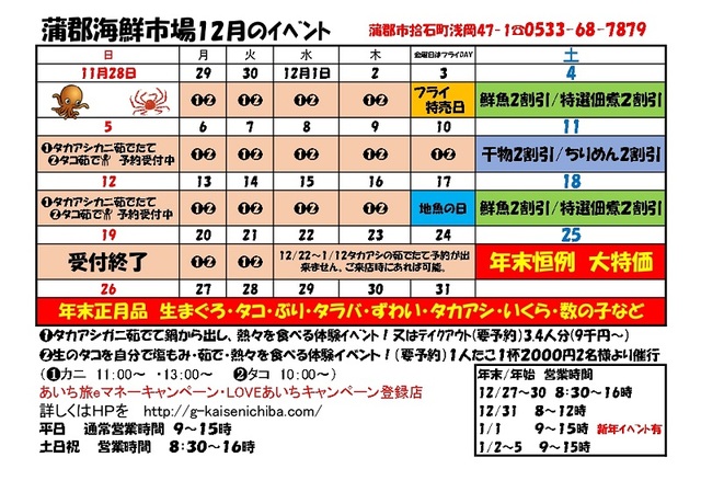 蒲郡海鮮市場では、毎月楽しい&お得なイベントをご用意しております。