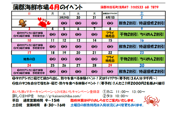 イベント情報 ホーム > イベント情報 > 4月のイベントのご案内! 4月のイベントのご案内! 蒲郡海鮮市場では、毎月楽しい&お得なイベントをご用意しております。 今月も大人気「タカアシガニ茹で体験」「タコ茹で体験」がもりだくさん!もちろん鮮魚や干物など蒲郡の美味しい海産物の特売日もあります。春の旬の食材を是非お楽しみください♪ 蒲郡海鮮市場では、スタッフの健康管理やマスク着用、消毒の徹底などお客様の安全に細心の注意を払い営業をしております。イベント日程表をご確認のうえ、ご家族やお友達とぜひお越しください!