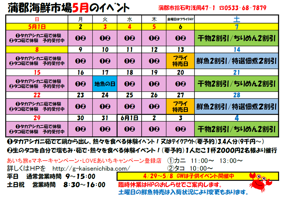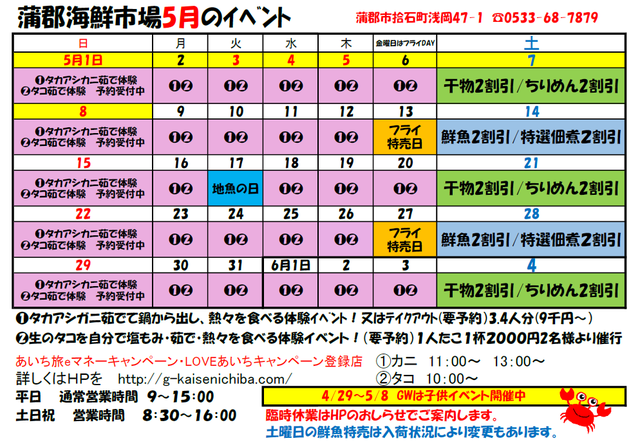 イベント情報 ホーム > イベント情報 > 5月のイベントのご案内! 5月のイベントのご案内! 蒲郡海鮮市場では、毎月楽しい&お得なイベントをご用意しております。 今月も大人気「タカアシガニ茹で体験」「タコ茹で体験」がもりだくさん!GWのイベントや、鮮魚や干物など蒲郡の美味しい海産物の特売日もあります。蒲郡海鮮市場では、スタッフの健康管理やマスク着用、消毒の徹底などお客様の安全に細心の注意を払い営業をしております。イベント日程表をご確認のうえ、ご家族やお友達とぜひお越しください!