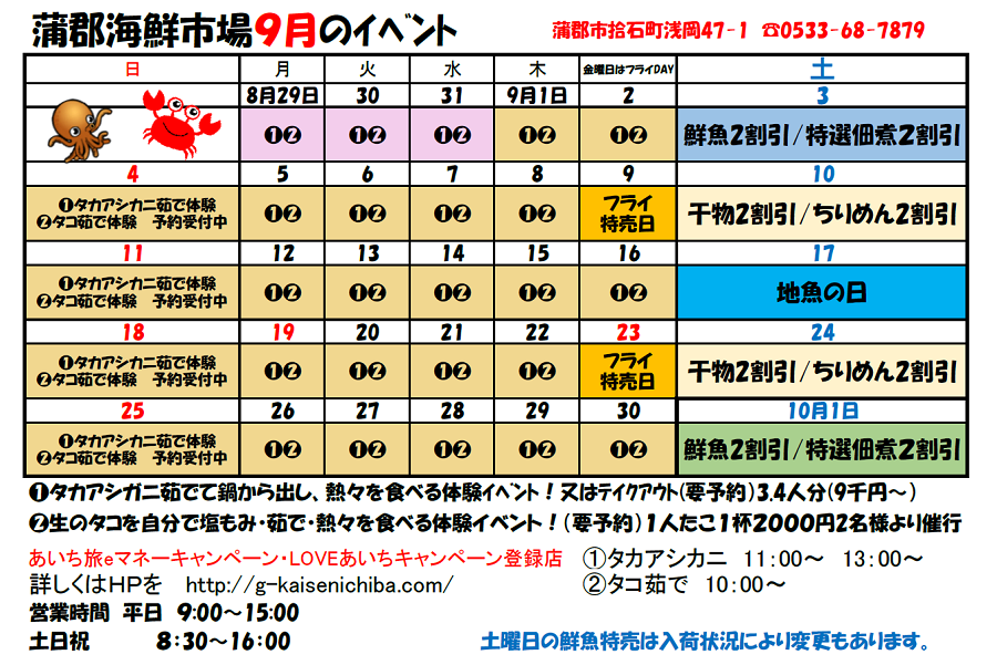 蒲郡海鮮市場では、毎月楽しい&お得なイベントをご用意しております。