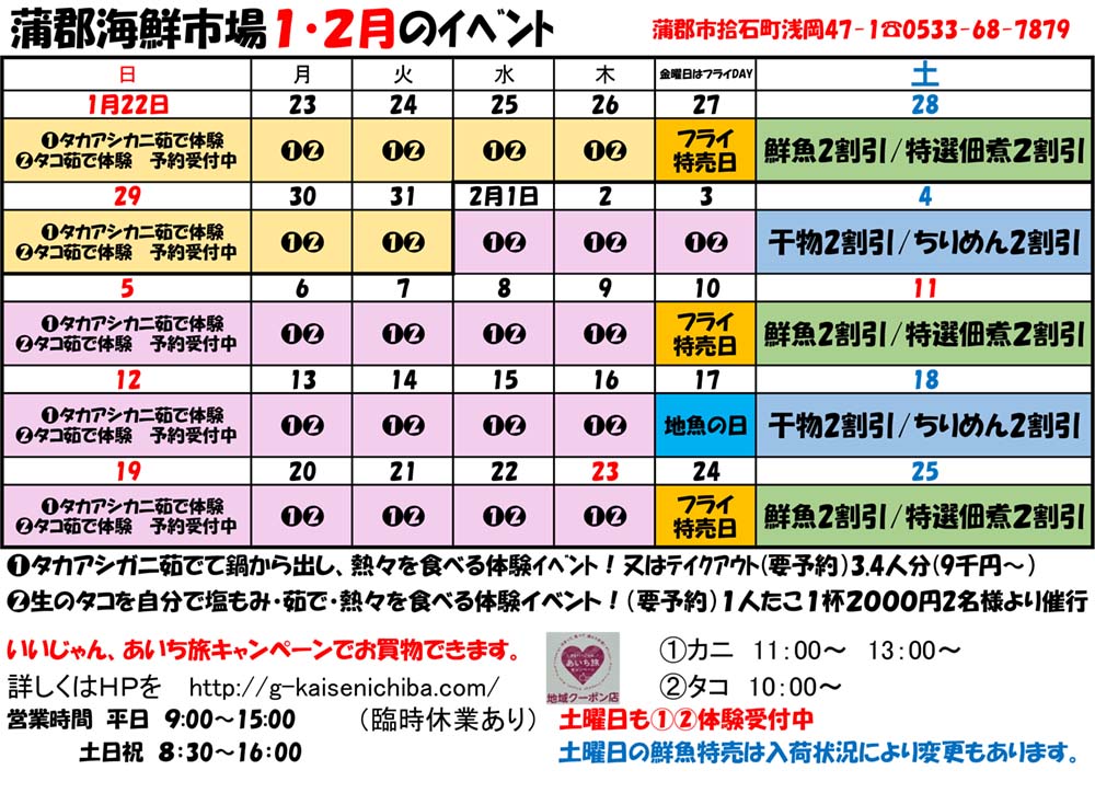 蒲郡海鮮市場では、毎月楽しい&お得なイベントをご用意しております。