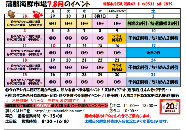 蒲郡海鮮市場では、毎月楽しい&お得なイベントをご用意しております。
