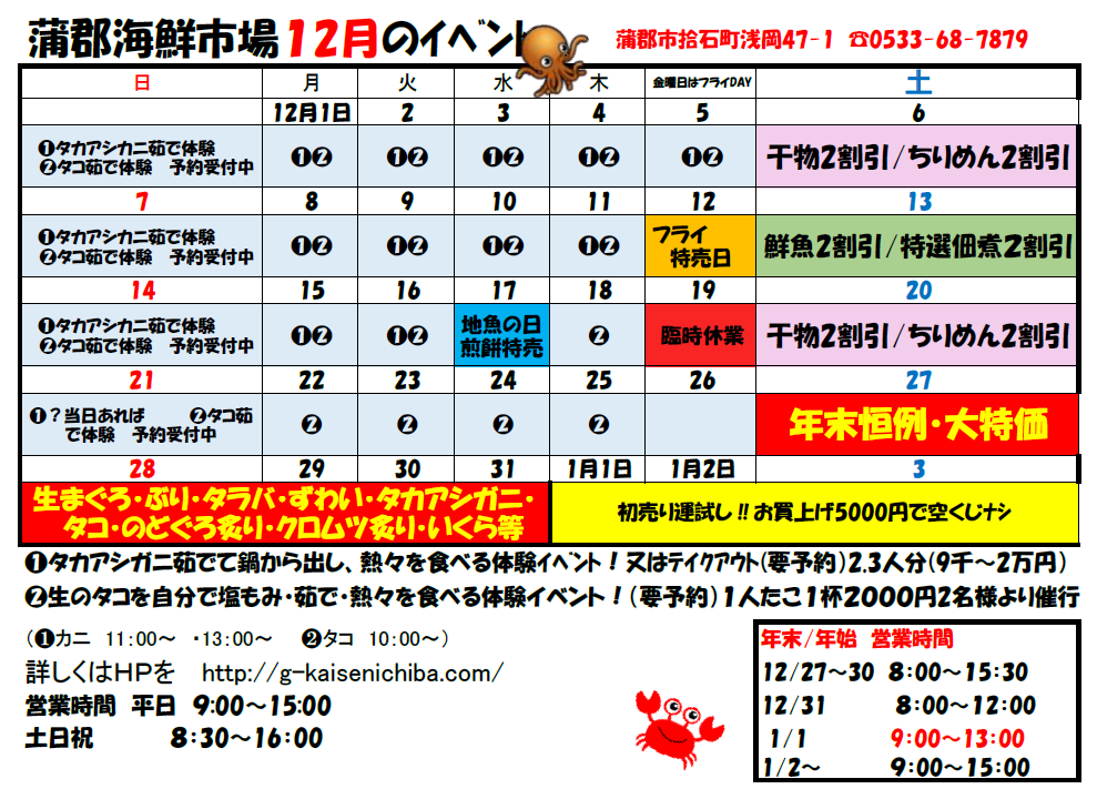 蒲郡海鮮市場では、毎月楽しい&お得なイベントをご用意しております。