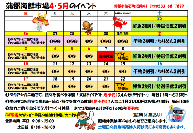 蒲郡海鮮市場では、毎月楽しい&お得なイベントをご用意しております。