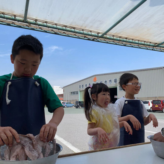 ご家庭ではなかなかしない、生のタコを塩もみして・ゆで・その場でたべる体験「漁師さん秘伝の方法」を伝授します。