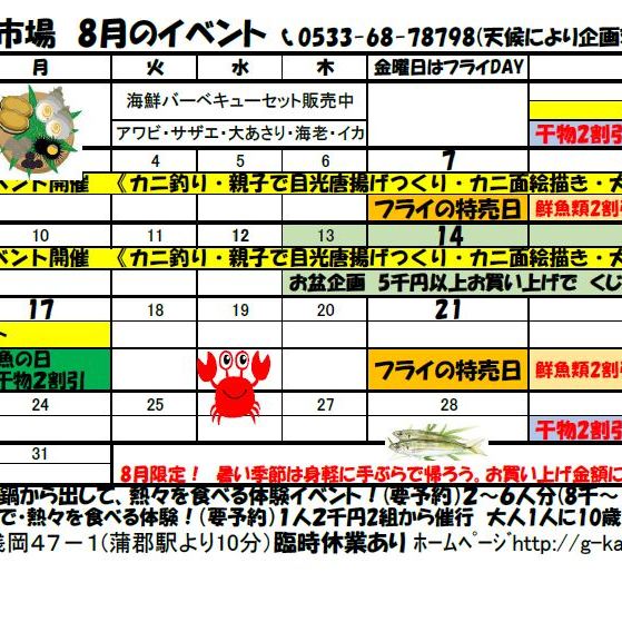 今月はいつものタカアシガニ茹で体験、タコ茹で体験や地魚の日に加え、夏休みやお盆の特別イベントをもりだくさんで予定しております…