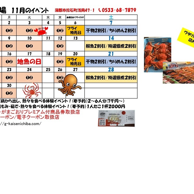今月はいつものタカアシガニ茹で体験、タコ茹で体験や地魚の日に加え、「特製ニギスフライの特売」や「あさり・鮮魚」など蒲郡の美味…